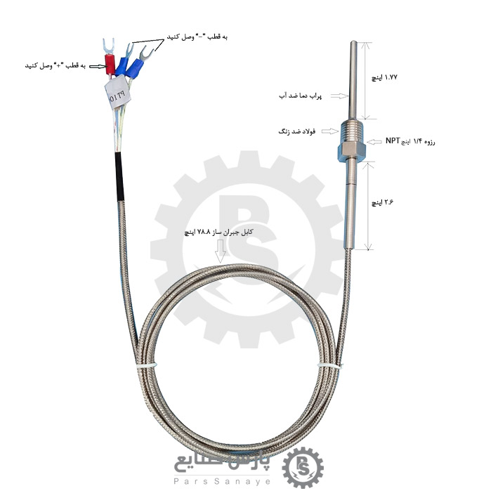 این سنسور PT100 با رزوه 1/4 دارای دقت و انعطاف پذیری بالایی می باشد. همچنین دارای محفظه و غلاف از جنس فولاد ضد زنگ با استحکام بالا و مقاوم در برابر خوردگی می باشد. متقاضیان می توانند متریال کابل رابط را به صورت اختیاری از جنس سیم بافته شده فلزی، سیم فایبر گلاس و غیره سفارش دهند. همچنین این سنسور دما دارای سیم محافظ جبران ساز به طول 2 متر می باشد.